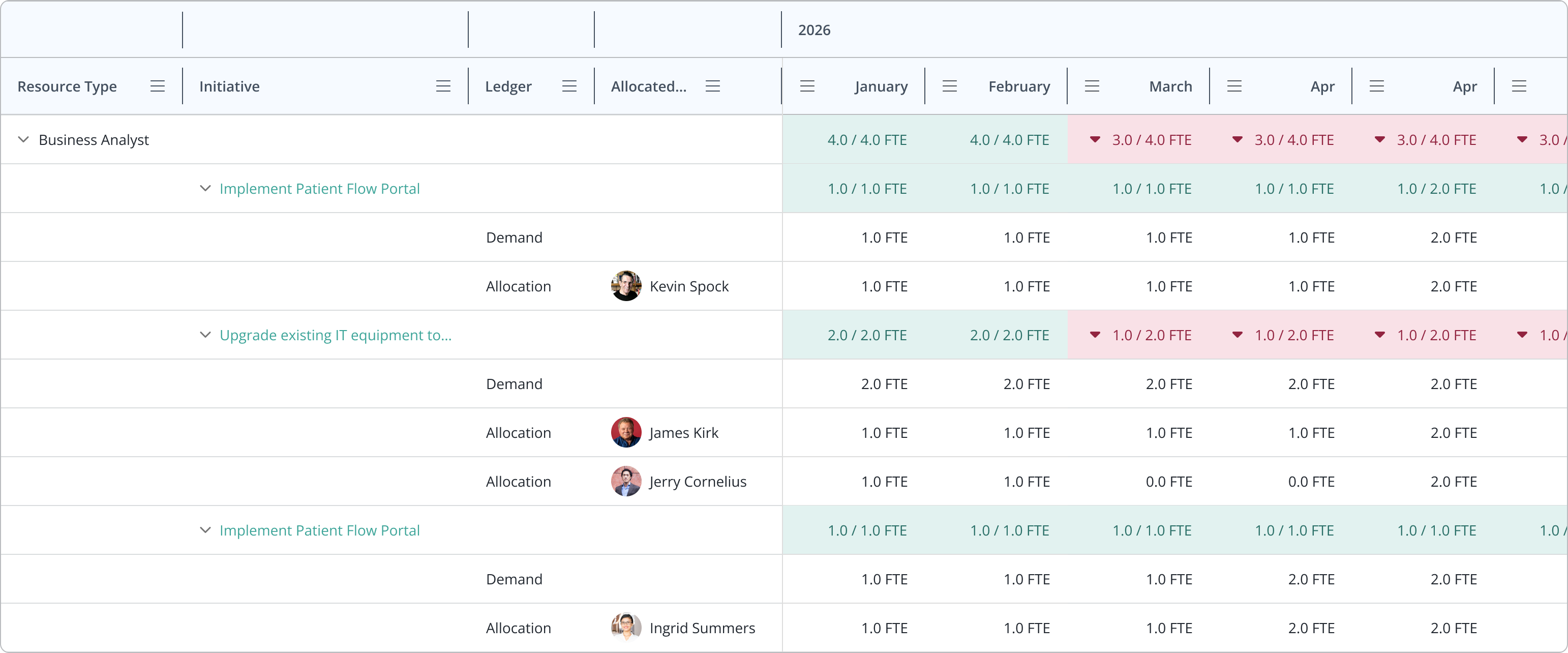 During initiative planning, teams define how much of a resource is required over time — not named individuals. - Compare demand vs capacity